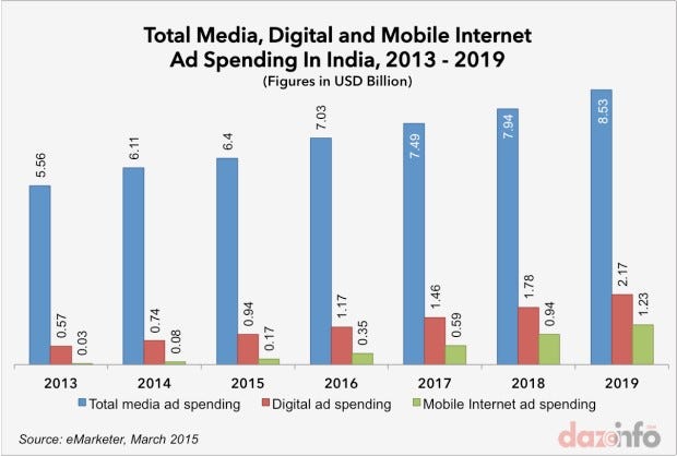Indias digital advertisement market is expected to grow at a compound annual growth rate cagr of 335 per cent to cross the rs 25500 crore us 38 billion mark by 2020 the internets share in total advertising revenue is anticipated to grow twofold from eight per cent in 2013 to 16 per cent in 2018. Traditional channels will remain important however as advertisers begin to think more holistically about their advertising and marketing budgets.